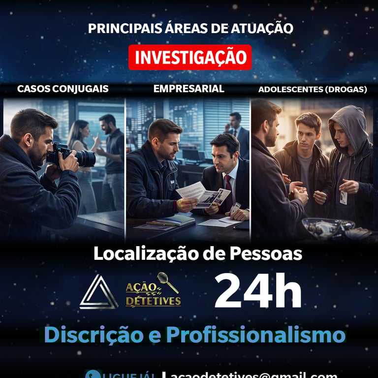 A Ação Detetives oferece apoio em casos delicados, como suspeitas de mudanças de comportamento ou envolvimento com drogas de um ente querido. Atuamos com sigilo e rapidez, fornecendo provas concretas para garantir o bem-estar e a segurança da sua família.
